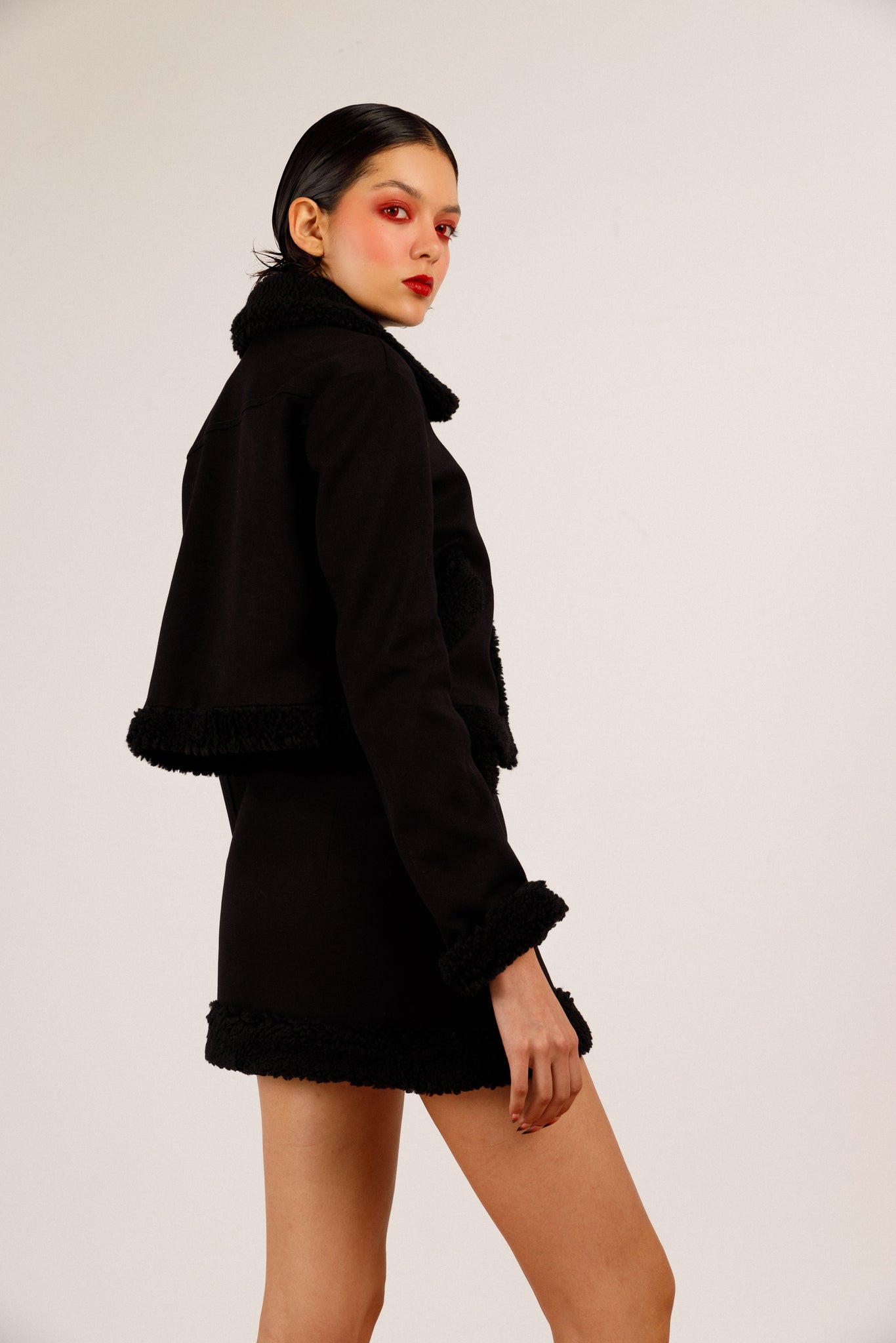 Wool twill jacket with lining and sheepskin trim. Straight and cropped fit.